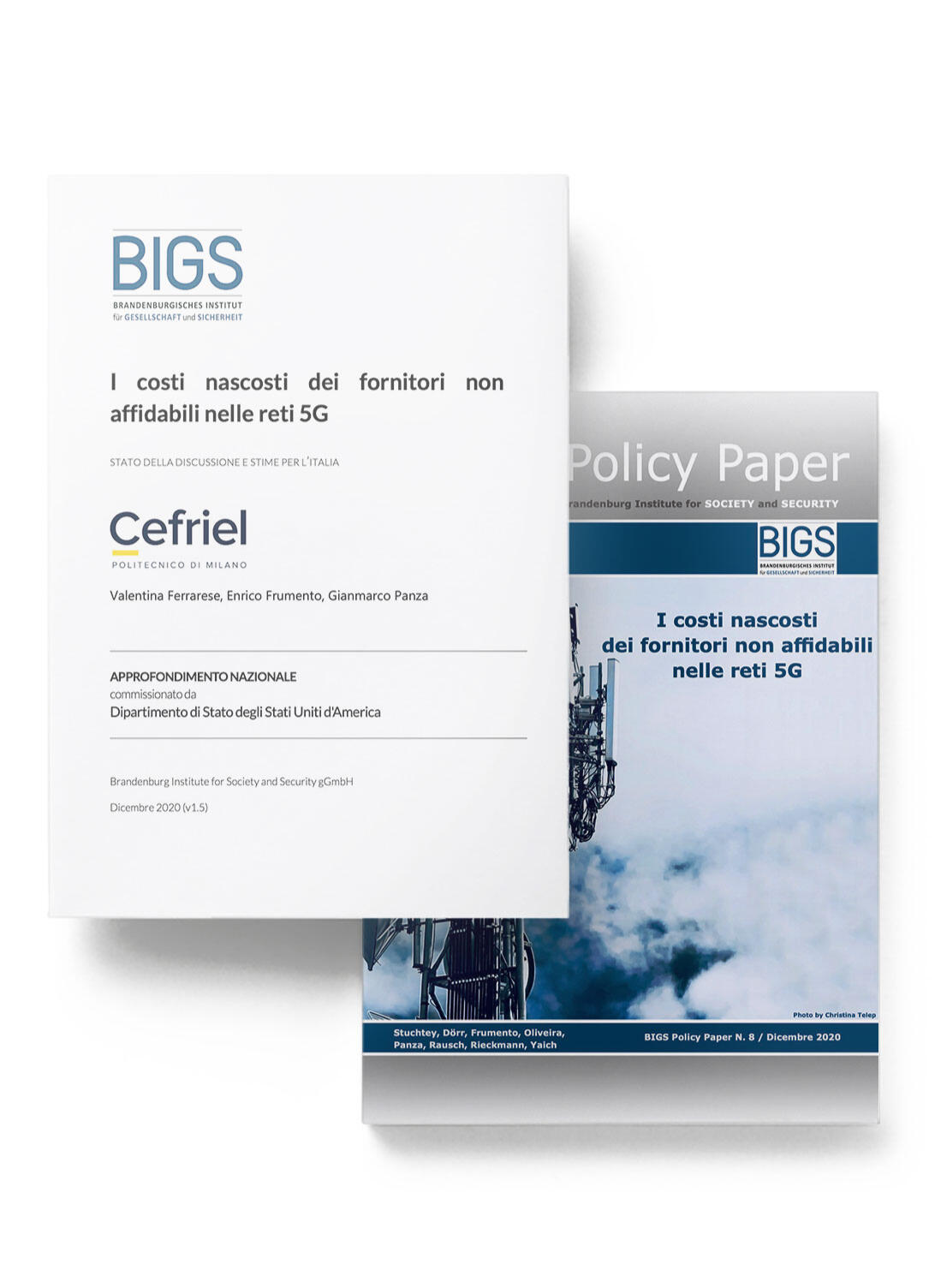 Il Policy Paper è risultato dello studio condotto da BIGS in collaborazione ad un gruppo multidisciplinare di esperti provenienti da Francia, Germania, Italia e Portogallo. Il documento presenta il quadro concettuale, l'identificazione di varie categorie di costi e alcune quantificazioni in merito ai costi nascosti dovuti all'utilizzo di di fornitori "non affidabili" nelle reti 5G.